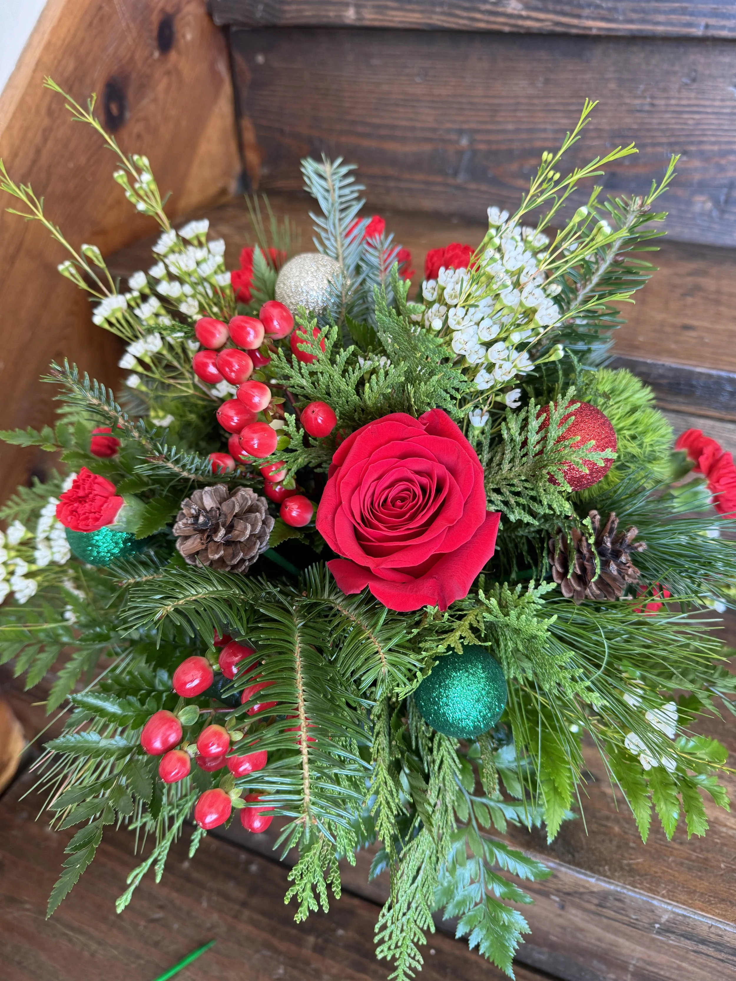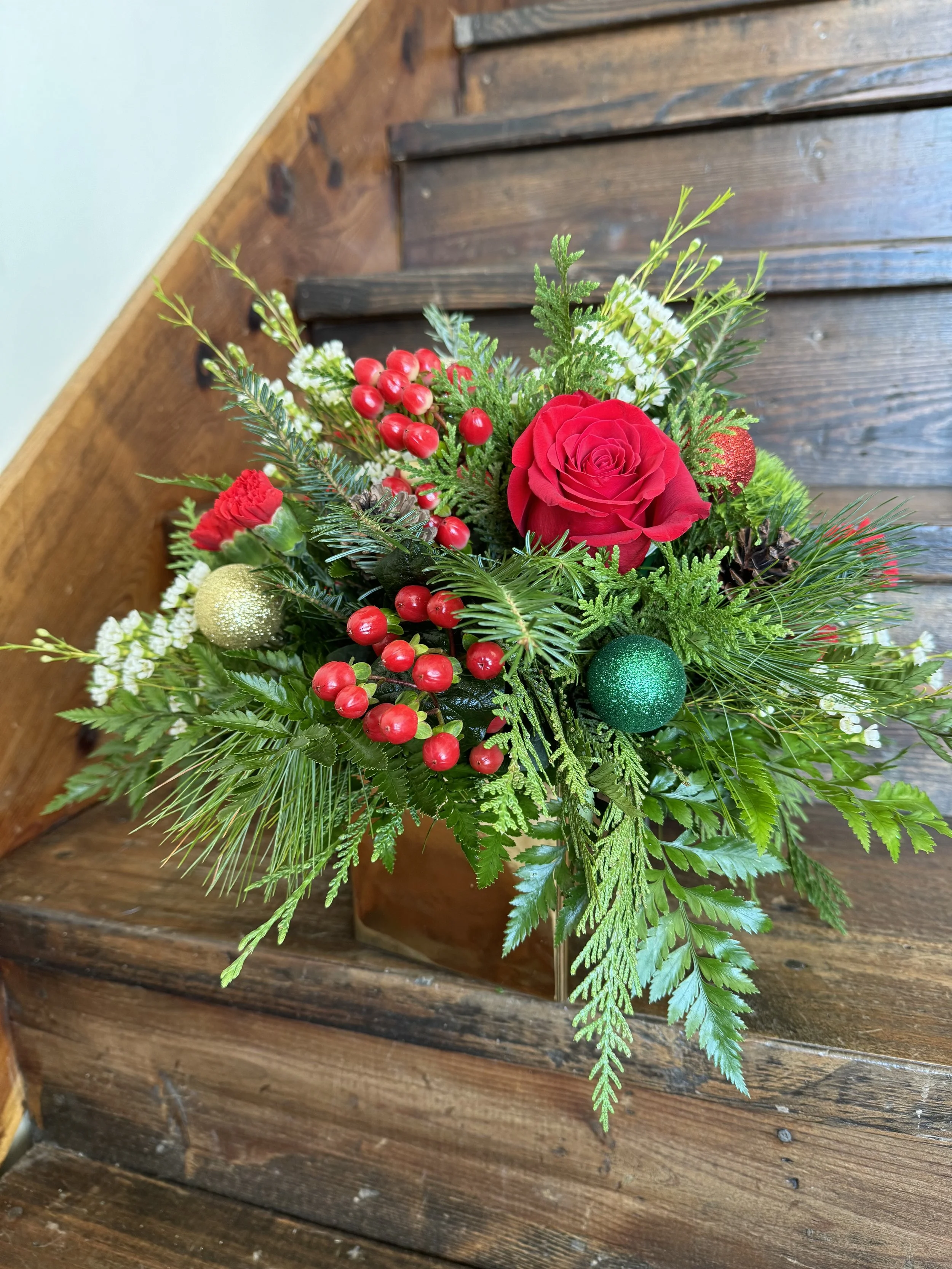 Have yourself a Merry Little Christmas with season flowers in a festive gold vase. Designed with blooms and ornaments in holiday red, green, and gold, this arrangement is the perfect way to wish your loved ones a Very Merry Christmas.